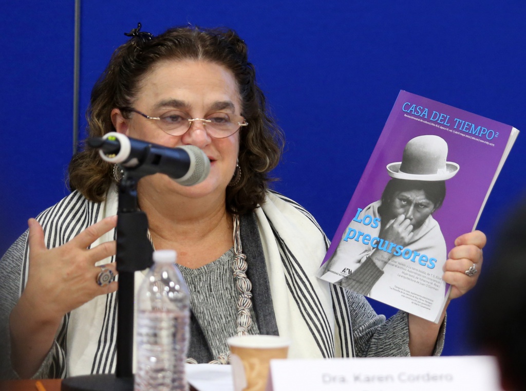 “Llama la atención que los artículos referidos a estos precursores fueron escritos por hombres, lo cual contrasta con la portada de la publicación donde aparece la imagen de una indígena boliviana, captada por la fotógrafa argentina Sara Facio (1979). El rostro de esta mujer parece preguntarse: ¿y estos hombres blancos y de élite qué?”, expresó la catedrática.