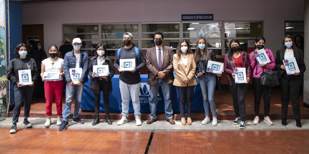 En una breve ceremonia presidida por el doctor Francisco Javier Soria López, rector de la UAM Xochimilco y la doctora María Angélica Buendía Espinosa, secretaria de esta Unidad, se otorgaron 20 tabletas de manera simbólica, para no interrumpir la actividad de estudio de las y los estudiantes becados (as).