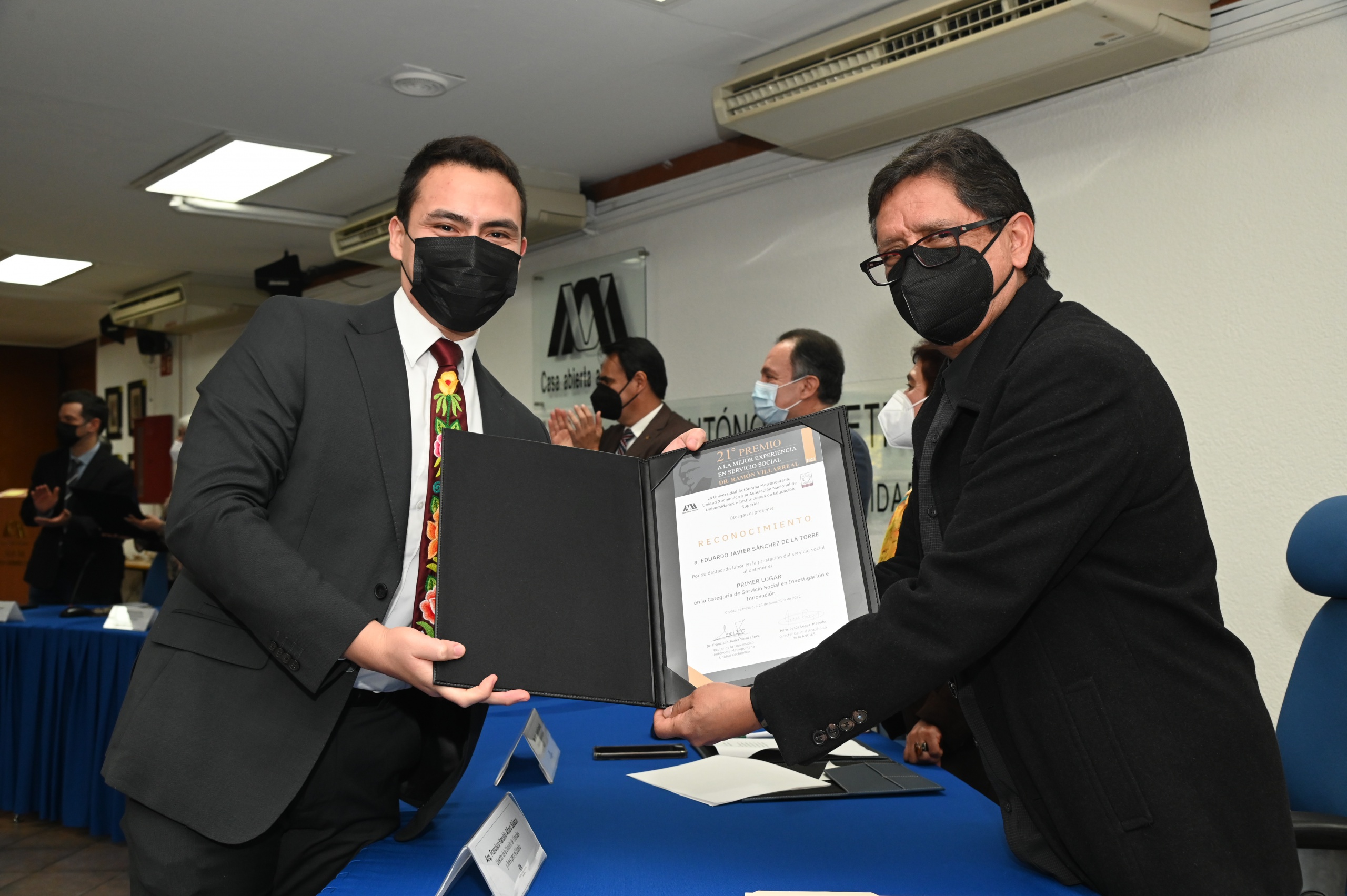 En la categoría de Servicio Social, en Investigación e Innovación, el primer lugar fue para Eduardo Sánchez de la Torre, de Medicina; el segundo se otorgó a Xitlalli Chaparro Zavala, de Planeación Territorial, y Karen Hernández Peña, egresada de Comunicación Social.