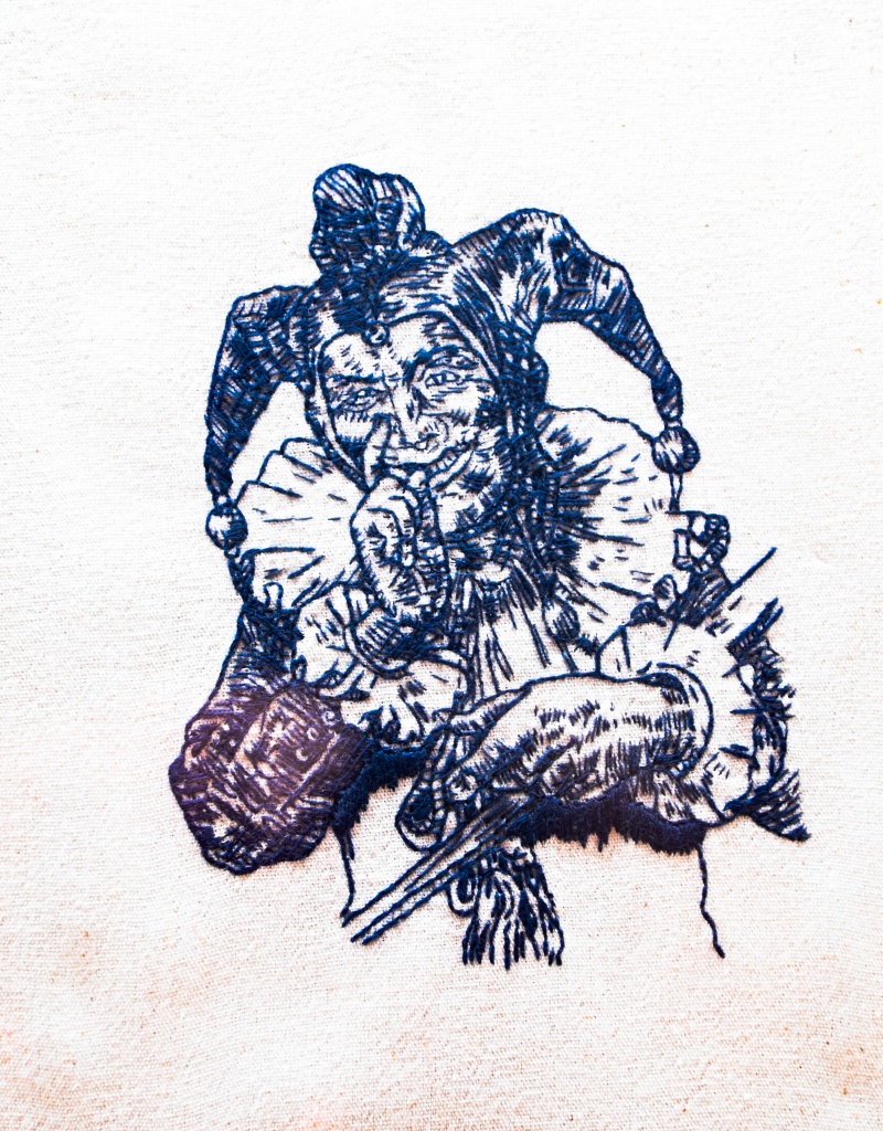 Las diversas ilustraciones bordadas en blanco y negro, hechas con el tradicional Blackwork, van más allá al introducir los rojos, sepias, anaranjados, amarillos, rosas y verdes para romper con los estereotipos del bordado con hilo negro. Al igual, experimenta con un soporte mexicano, como es la manta, para mostrar cómo el uso de esta técnica puede abarcar desde diseño ornamental hasta diseño de vestuario, lo que amplifica la adaptación diseñística.