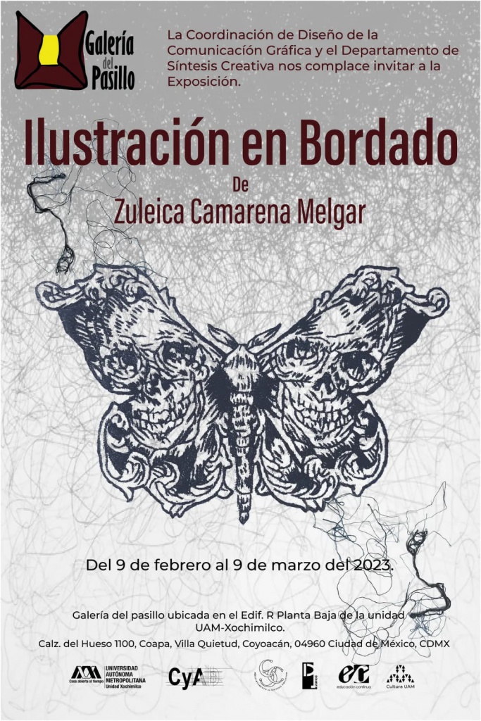 La Galería del Pasillo, ubicada en la planta baja del edificio R, de la Universidad Autónoma Metropolitana (UAM) Xochimilco, abre su espacio 2023 con la exposición “Ilustración de Bordado”, una obra de la artista Zuleica Camarena Melgar, exalumna de la licenciatura de Diseño de Comunicación Gráfica (DCG) de la División de Ciencias y Artes para el Diseño (CYAD), quien regresó a su alma mater a presentar sus diseños meticulosamente bordados que, a primera vista, da la impresión de haber sido elaborados con técnica de grabado.