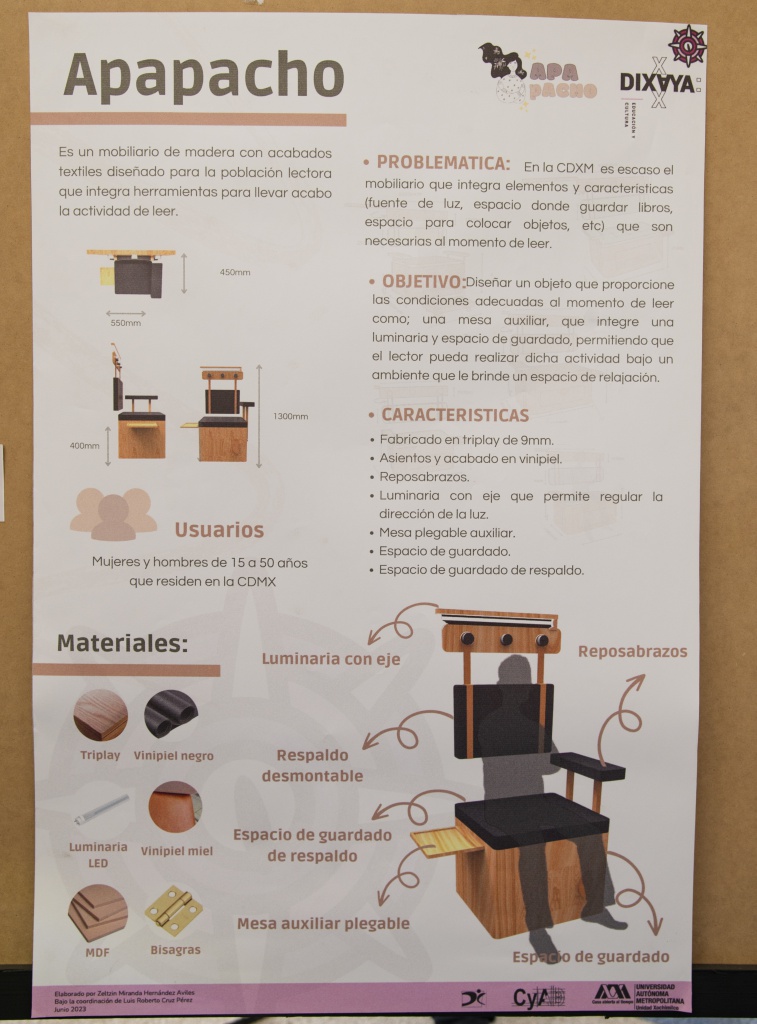Los asesores académicos responsables de los proyectos son Luis Roberto Cruz Pérez y Christian Byron Hernández, quienes realizaron el recorrido de estas propuestas de diseño junto al maestro Miguel Ángel Vázquez Sierra, coordinador de la licenciatura en Diseño Industrial, profesores y público en general. Allí, los alumnos explicaron su metodología y el proceso de diseño, así como las pruebas realizadas con los usuarios del producto a lo largo de un año.