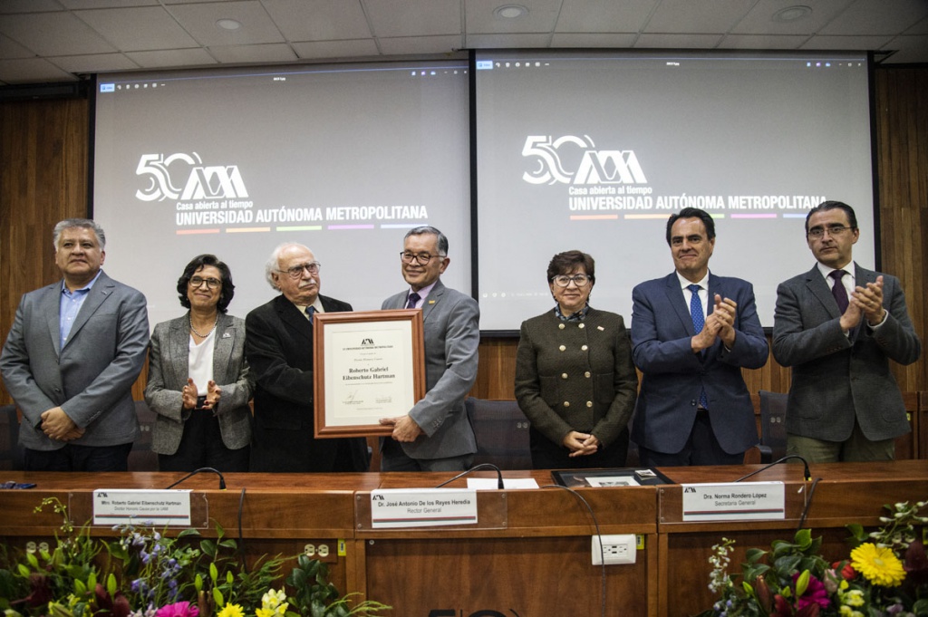 El maestro Roberto Eibenschutz Hartman, fundador de la división de Ciencias y Artes para el Diseño (CyAD) y exrector de la Universidad Autónoma Metropolitana, Unidad Xochimilco (UAM-X), se llevó una gran ovación durante la ceremonia de investidura como Doctor Honoris Causa por la UAM. La alta distinción le fue conferida por el Colegio Académico, en su sesión 543, por sus aportes en el campo de desarrollo territorial y su trayectoria académica sostenida a lo largo de 50 años.