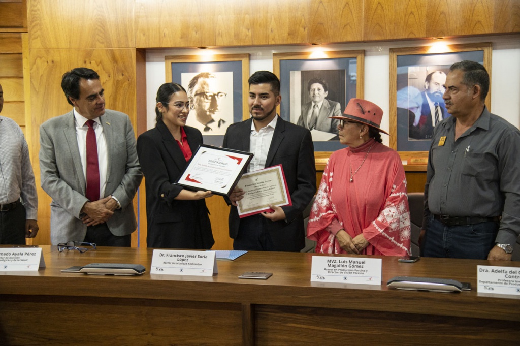 En el acto protocolario, la tesorera de la Fundación Lucía Martínez entregó la beca; mientras que el doctor Francisco Javier Soria López, rector de nuestra Unidad, y la doctora Martha Acosta (a través de la plataforma digital Zoom), destacaron el compromiso y el trabajo sostenido de las y los estudiantes, en particular en esta área de conocimiento fundamental para México, y en el que la producción porcina enfrenta un déficit del 50 por ciento.