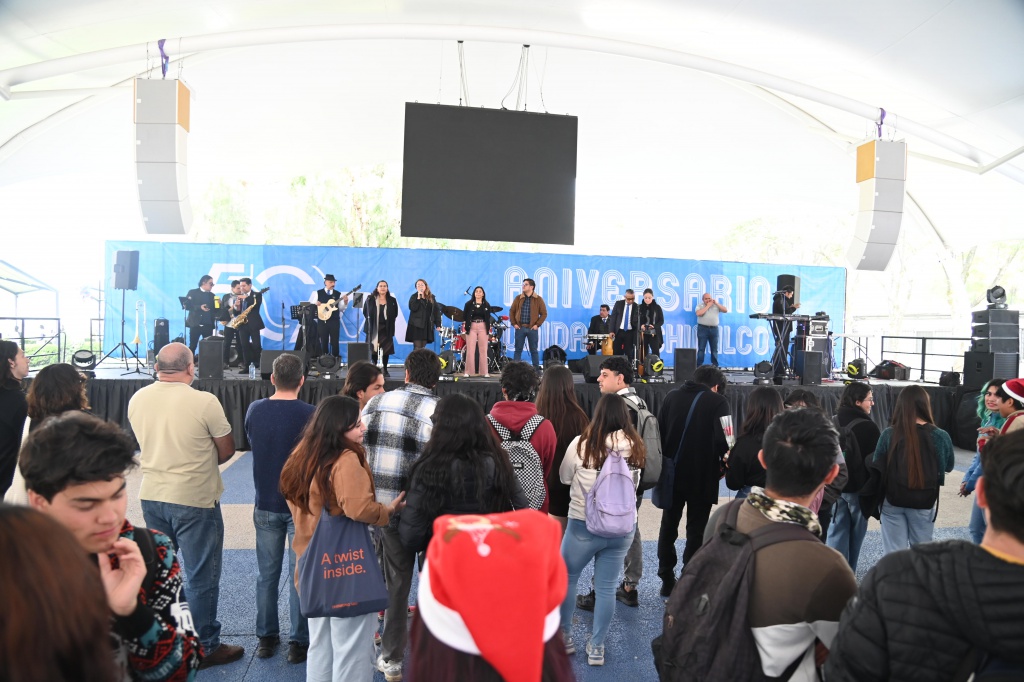 “Convive UAM-Xochimilco por la unidad” fue la posada que cerró la celebración del 50 aniversario de la UAMX, el pasado 18 de diciembre, en el Centro Cultural de esta sede. El evento cumplió el cometido de unir a los sectores estudiantiles, académicos y administrativos en un gran baile donde todos saltaron a la pista al escuchar las cumbias de los Ángeles Azules: “17 años”, “Cómo te voy a olvidar”, “Mis sentimientos”, “Nunca es suficiente”, entre otras “clásicas”, interpretadas por el grupo Pro Music con diez músicos en escena. El ánimo de esta posada se sostuvo con la energía de los jóvenes estudiantes que no pararon de bailar en este maratón navideño, jubilosos y felices. El evento fue organizado por la Rectoría y la Secretaría de la Unidad, conjuntamente con las divisiones de Ciencias y Artes para el Diseño, Ciencias Biológicas y de la Salud, y Ciencias Sociales y Humanidades.