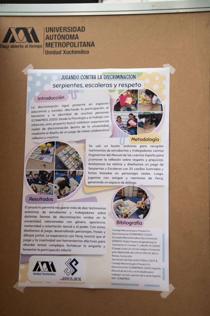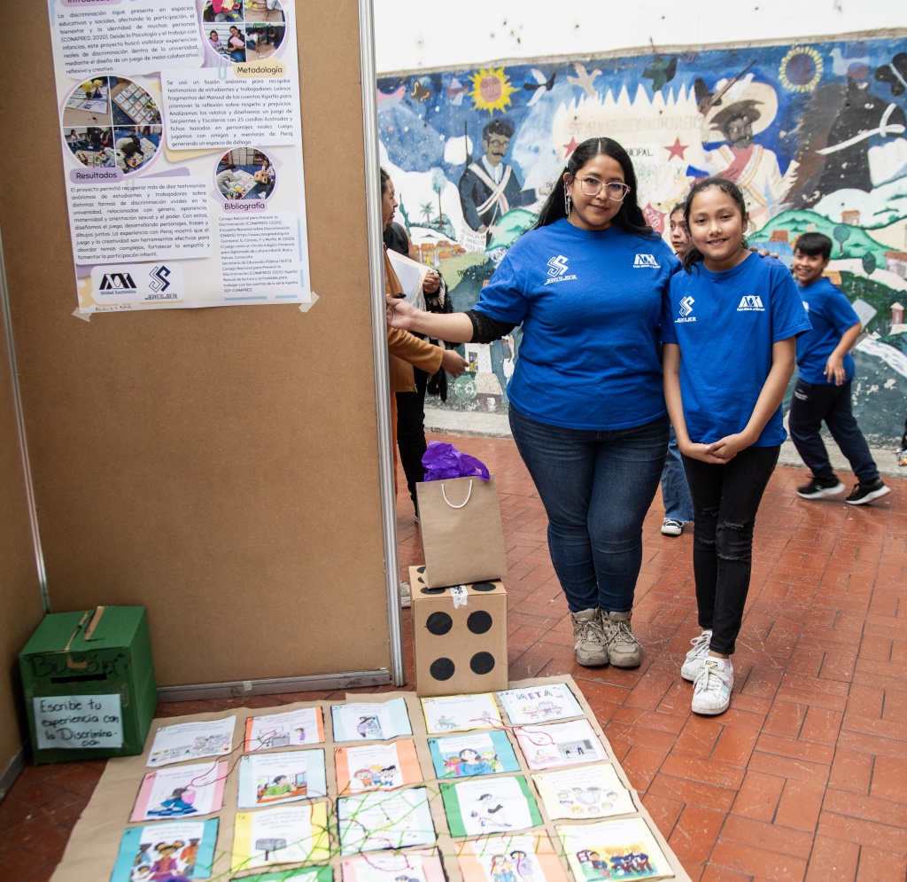 Alizon Daire Cárdenas Rodríguez, alumna de cuarto año y su mentora Ana Laura Romero, egresada de la licenciatura de Psicología, realizaron la investigación “Jugando contra la discriminación: Serpientes, escaleras y respeto”. El tema propuesto por Alizon consistió en recoger de forma anónima, a través de un buzón, experiencias de discriminación y bullying. Los testimonios de más de diez personas de la comunidad universitaria fueron plasmados en el juego, con un total de 25 casillas ilustradas que incluían reflexiones de respeto, donde las fichas fueron diseñadas con las características de personajes reales. Con esta investigación mostramos cómo a través del juego, podemos abordar temas complejos, fortalecer la empatía y fomentar la participación infantil, refirió Laura Romero.